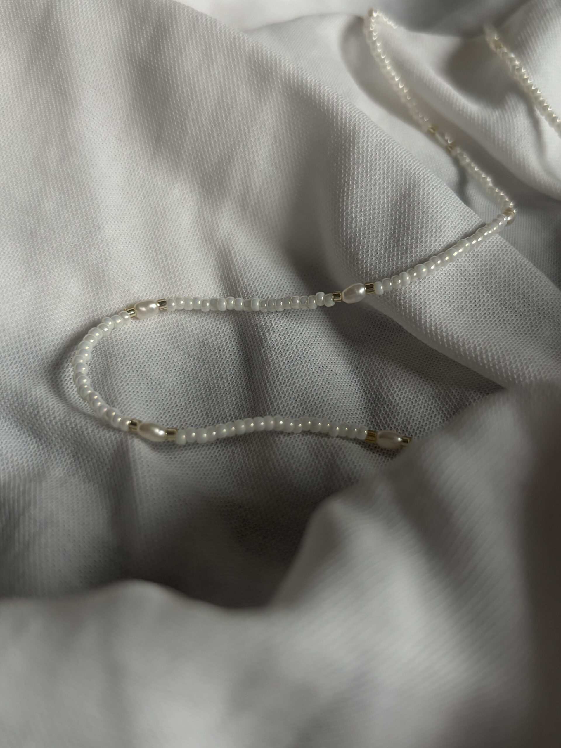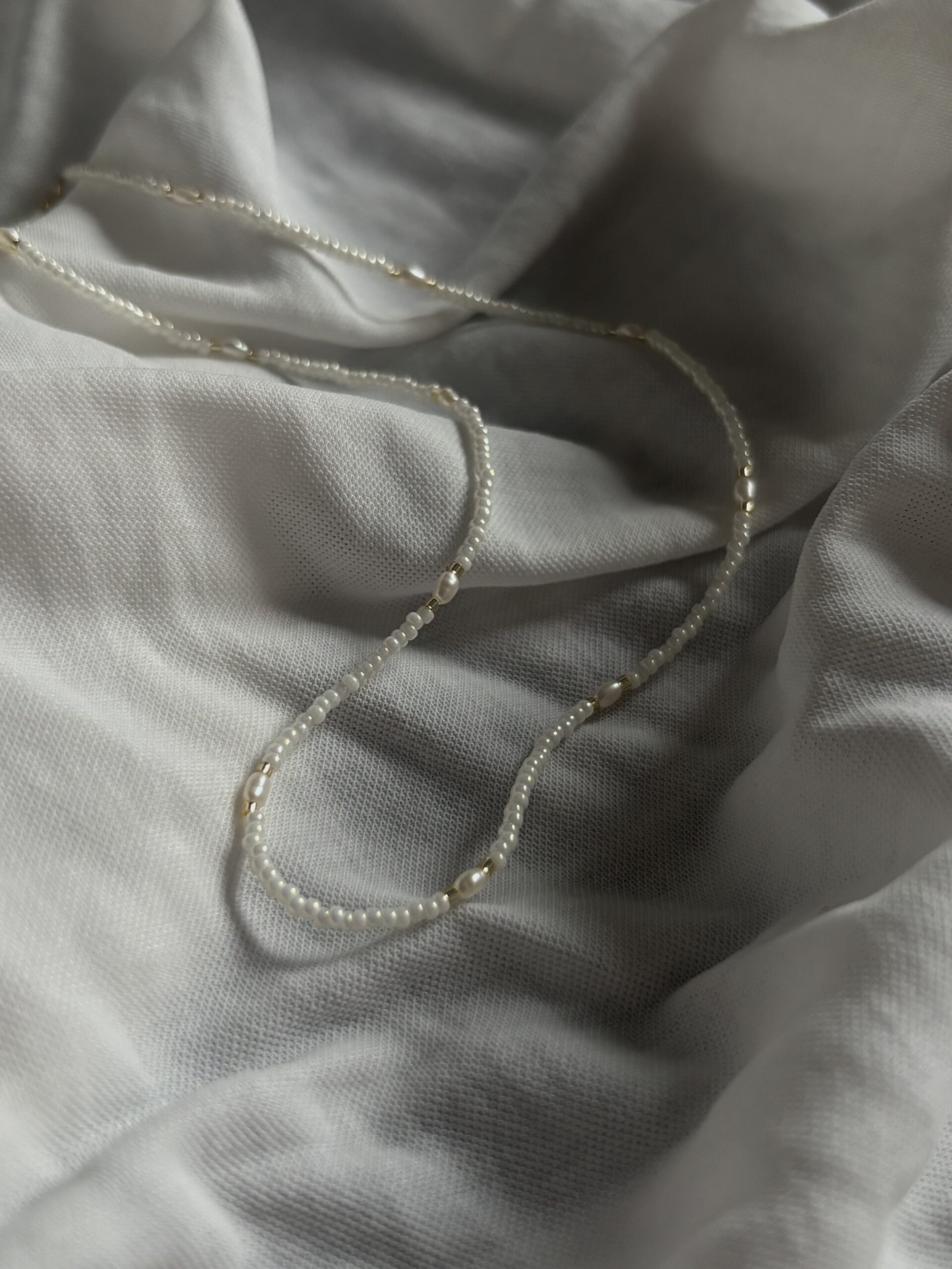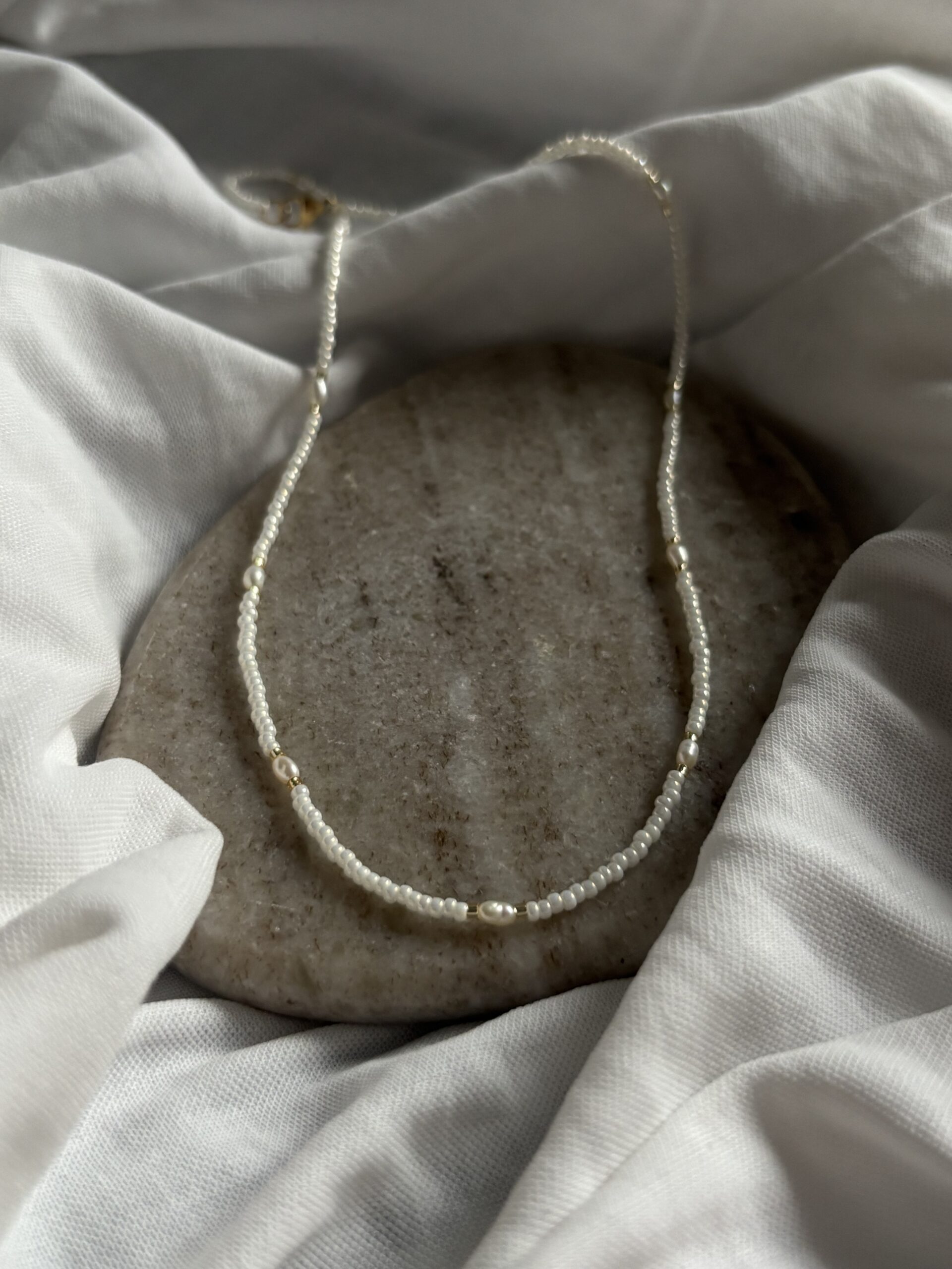 Jemný a elegantní choker z kvalitních Miyuki korálků je dokonalým doplňkem pro milovnice minimalistického stylu. Precizně zpracované drobné korálky vytváří čistý vzhled, který je oživen drobnými říčními perlami.