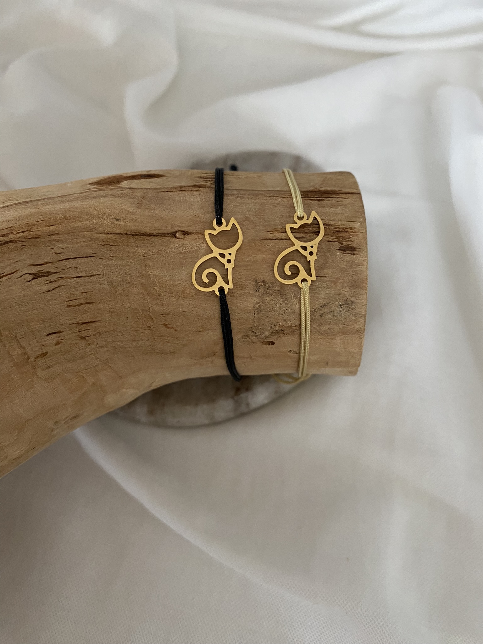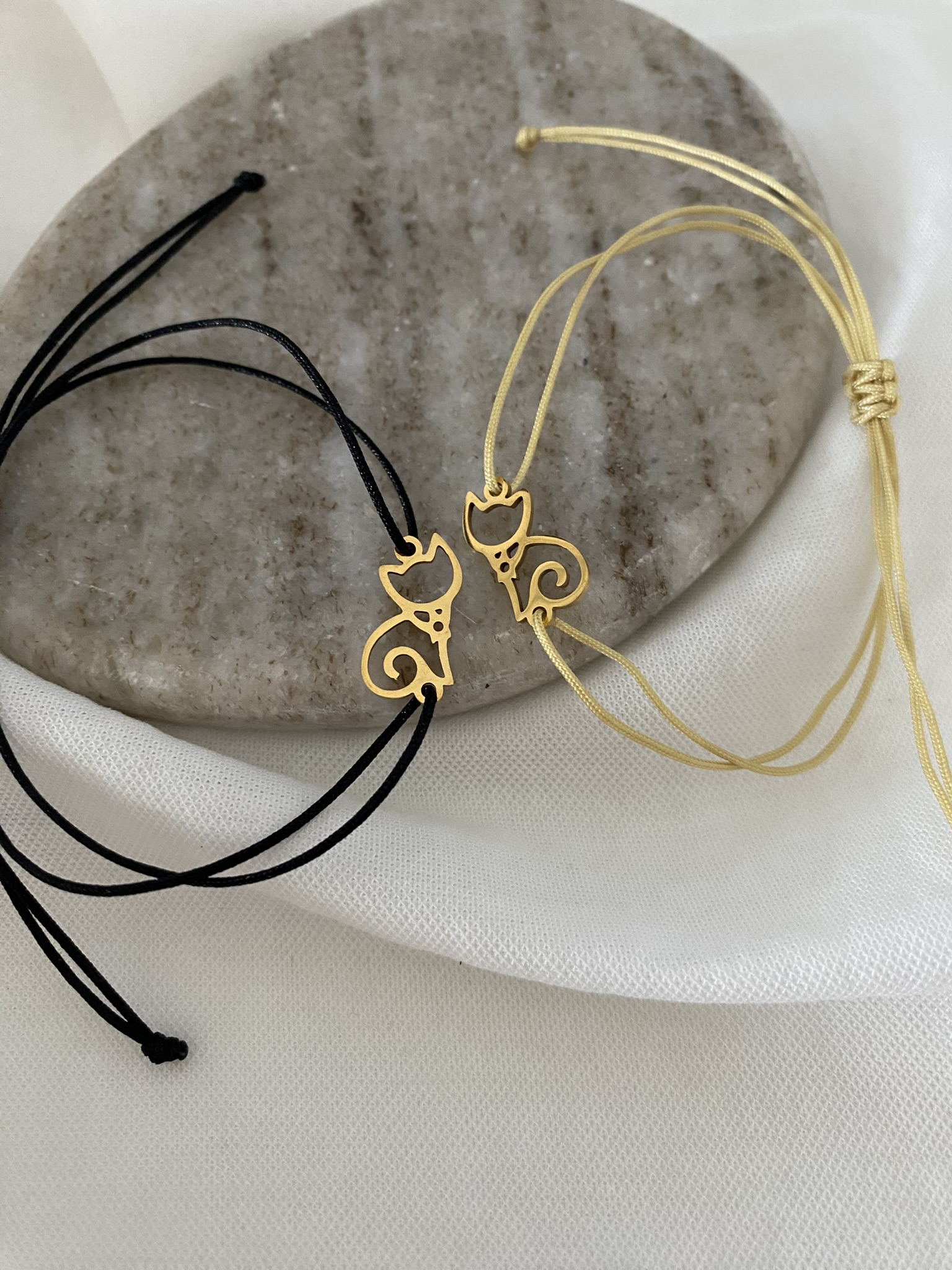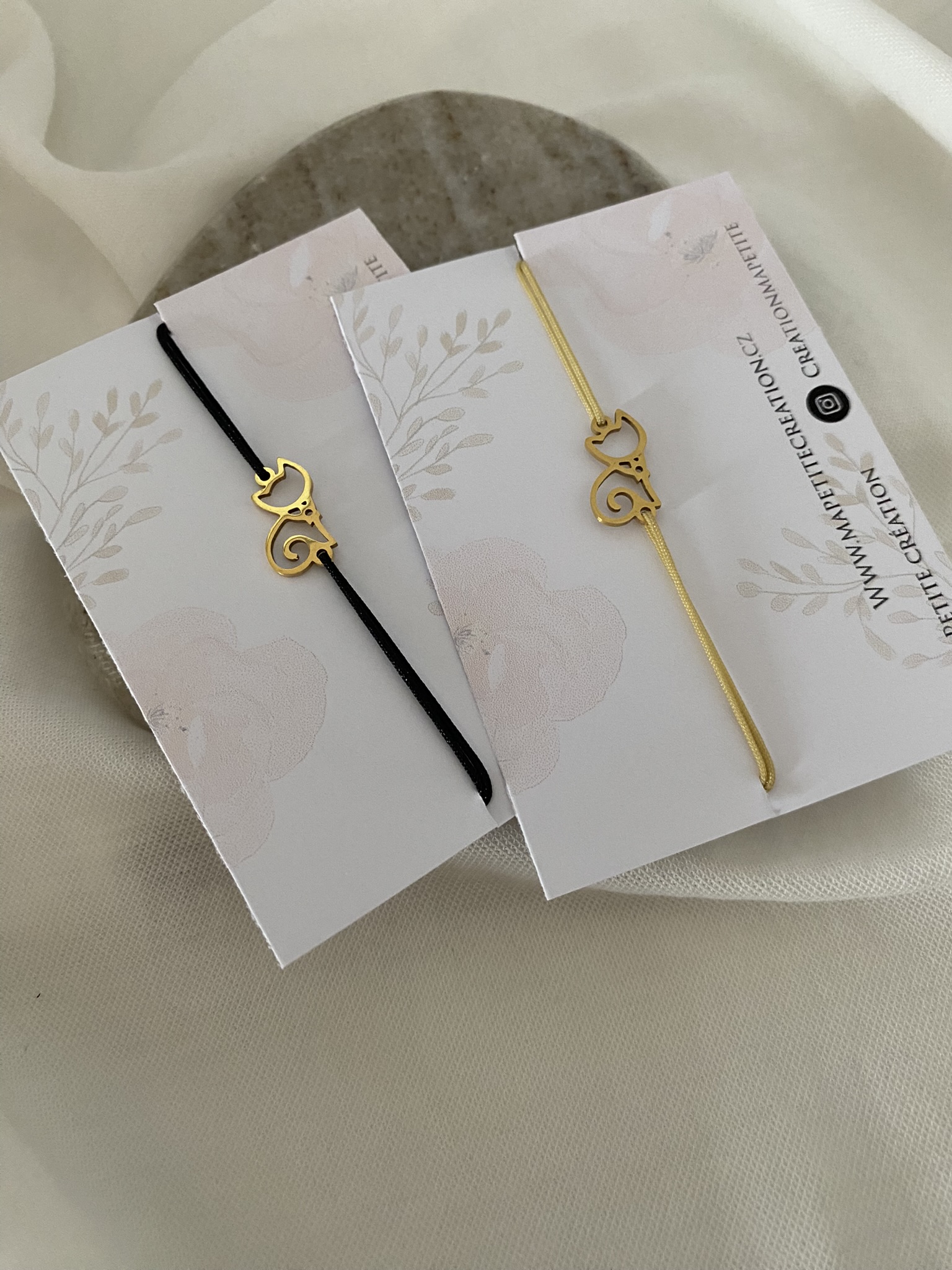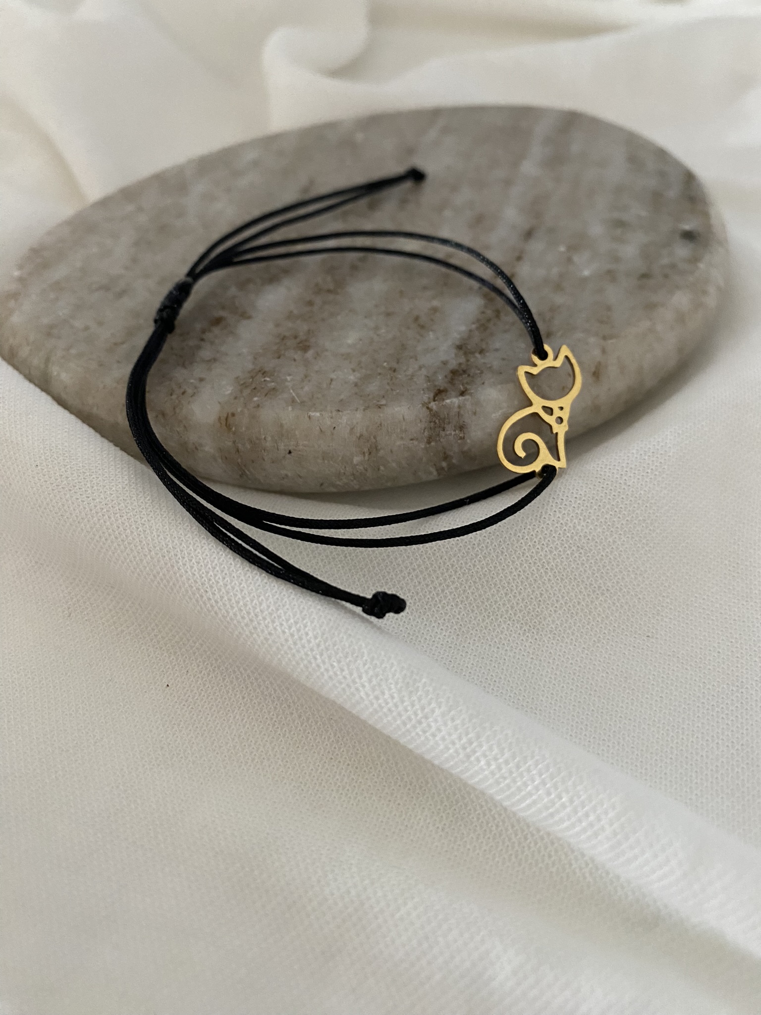 Jemný šňůrkový náramek s kočičkou v zlatém odstínu.