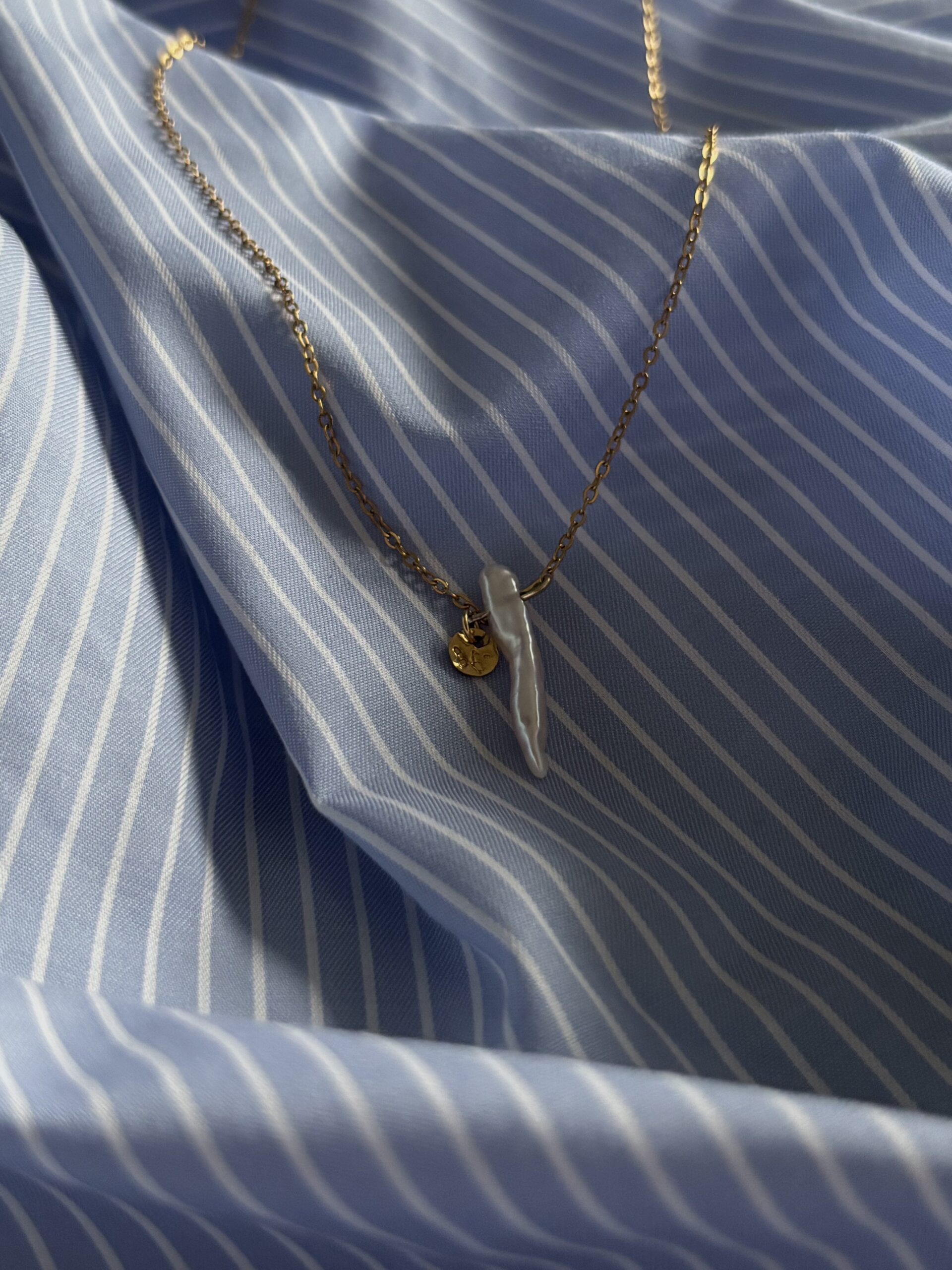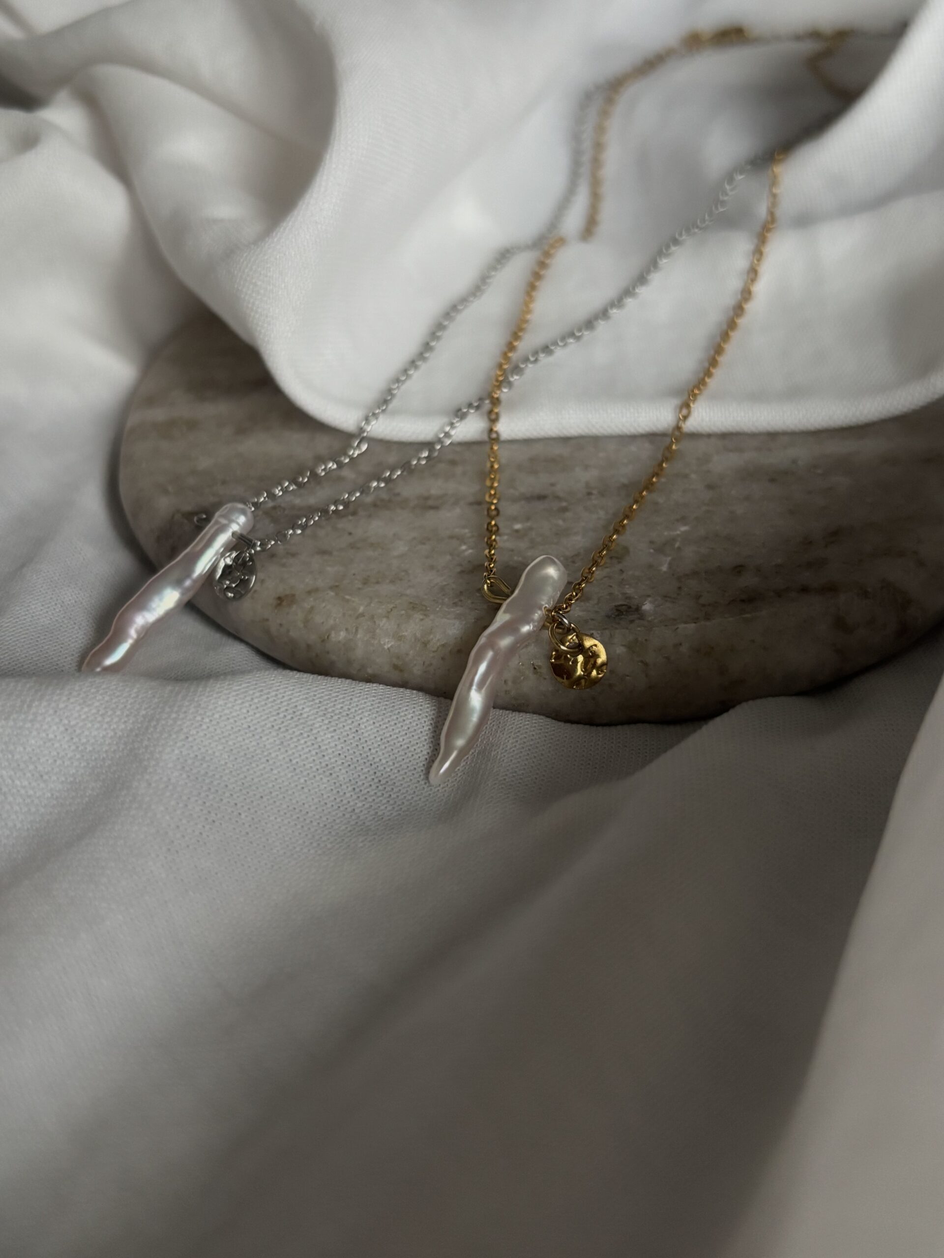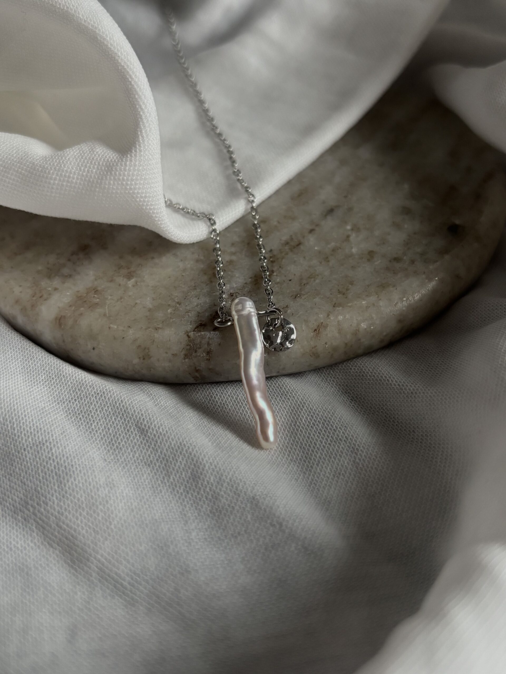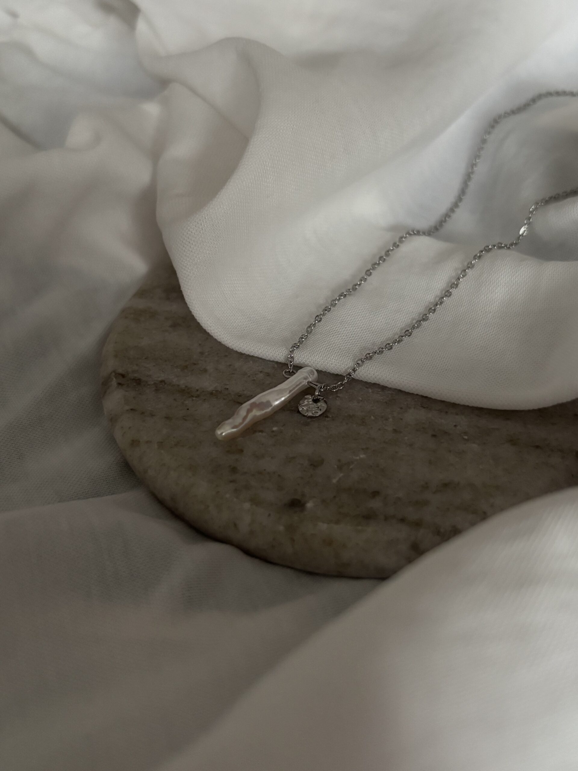 Elegantní náhrdelník z chirurgické oceli zaujme na první pohled svou přirozenou krásou a jedinečným designem. Dominantou je pravá říční perla nepravidelného tvaru, díky které je každý kus naprostý originál. Jemný řetízek je doplněn malým tepaným medailonkem, jenž dodává šperku osobitý a moderní vzhled.