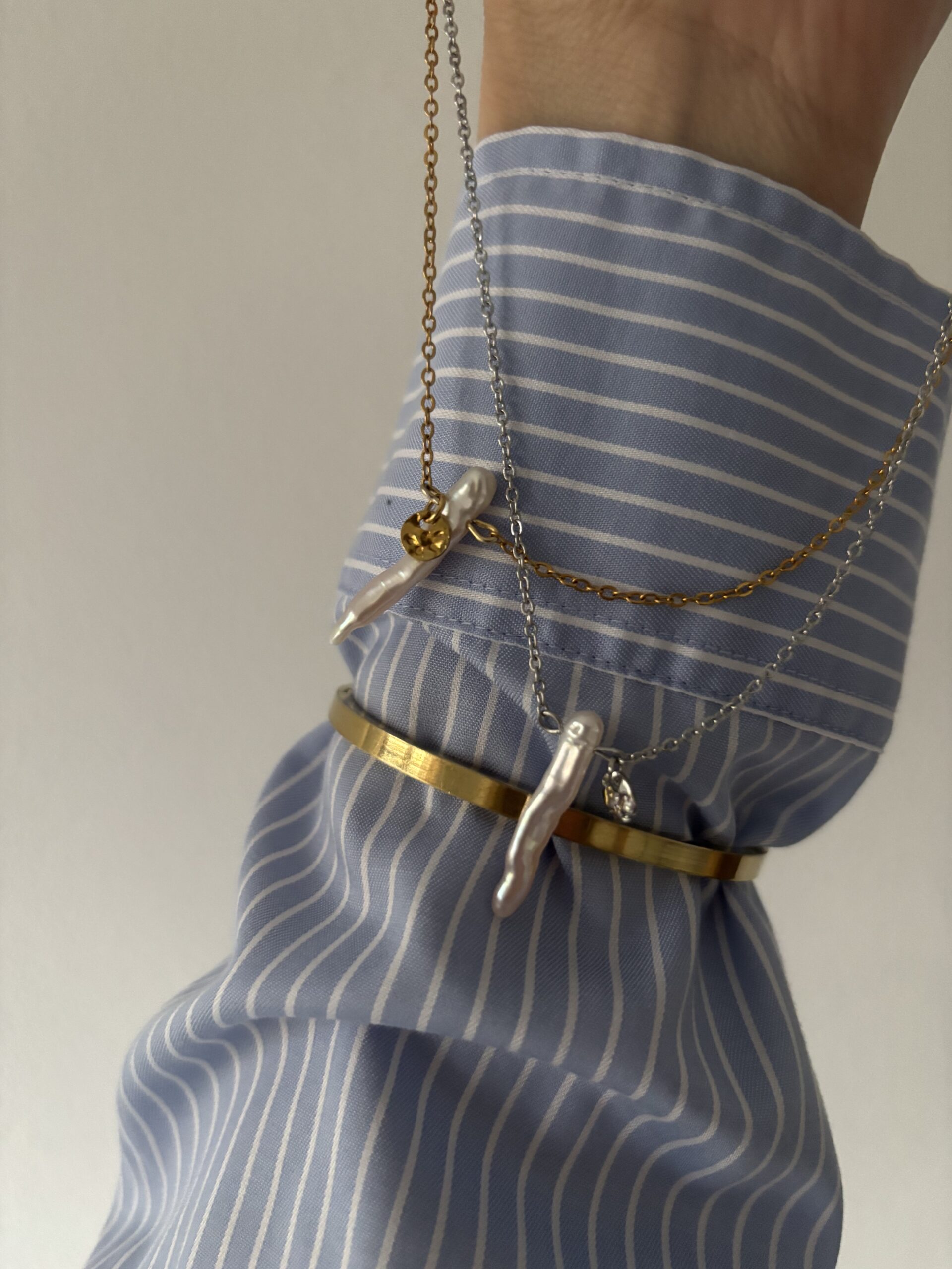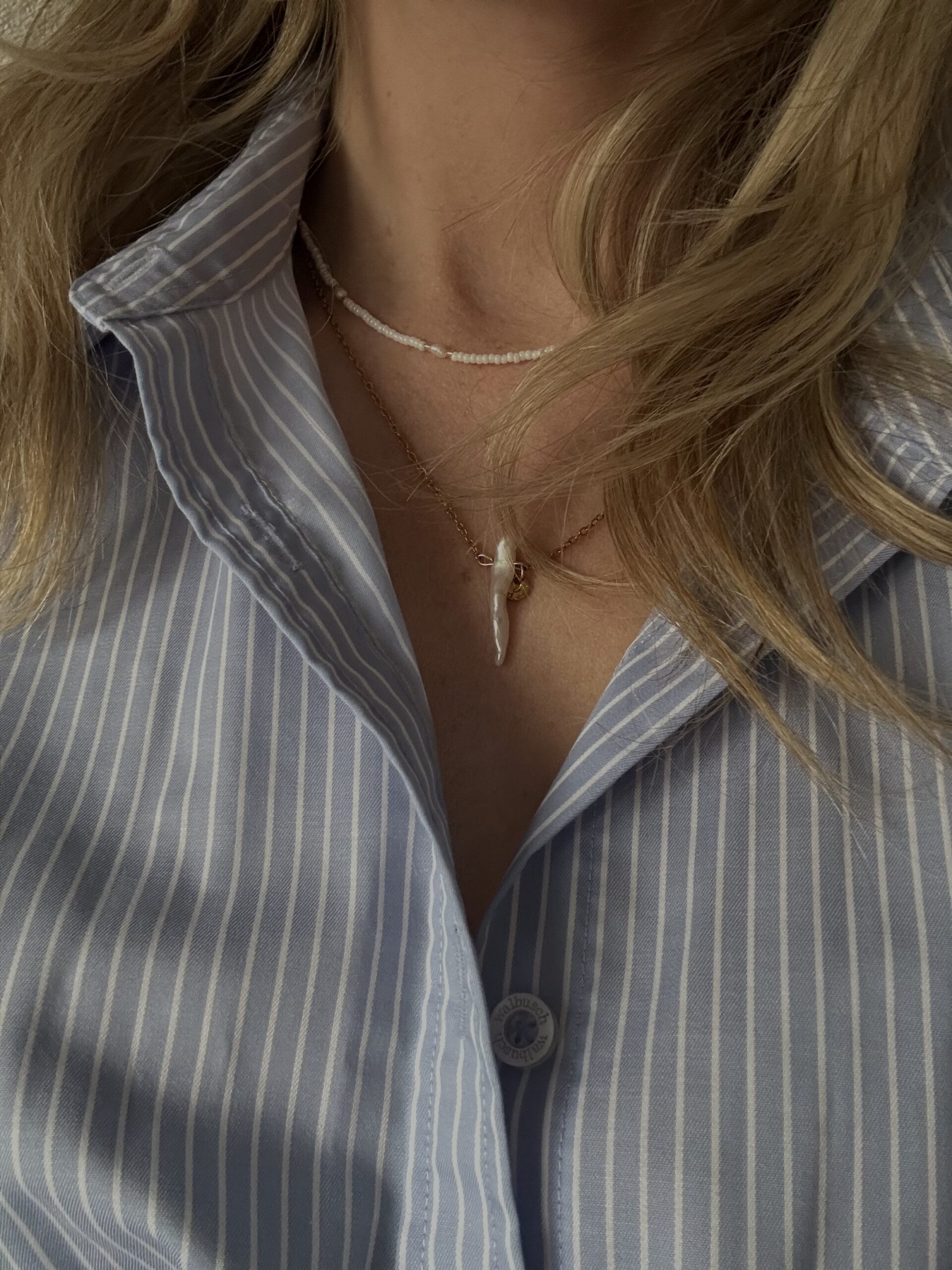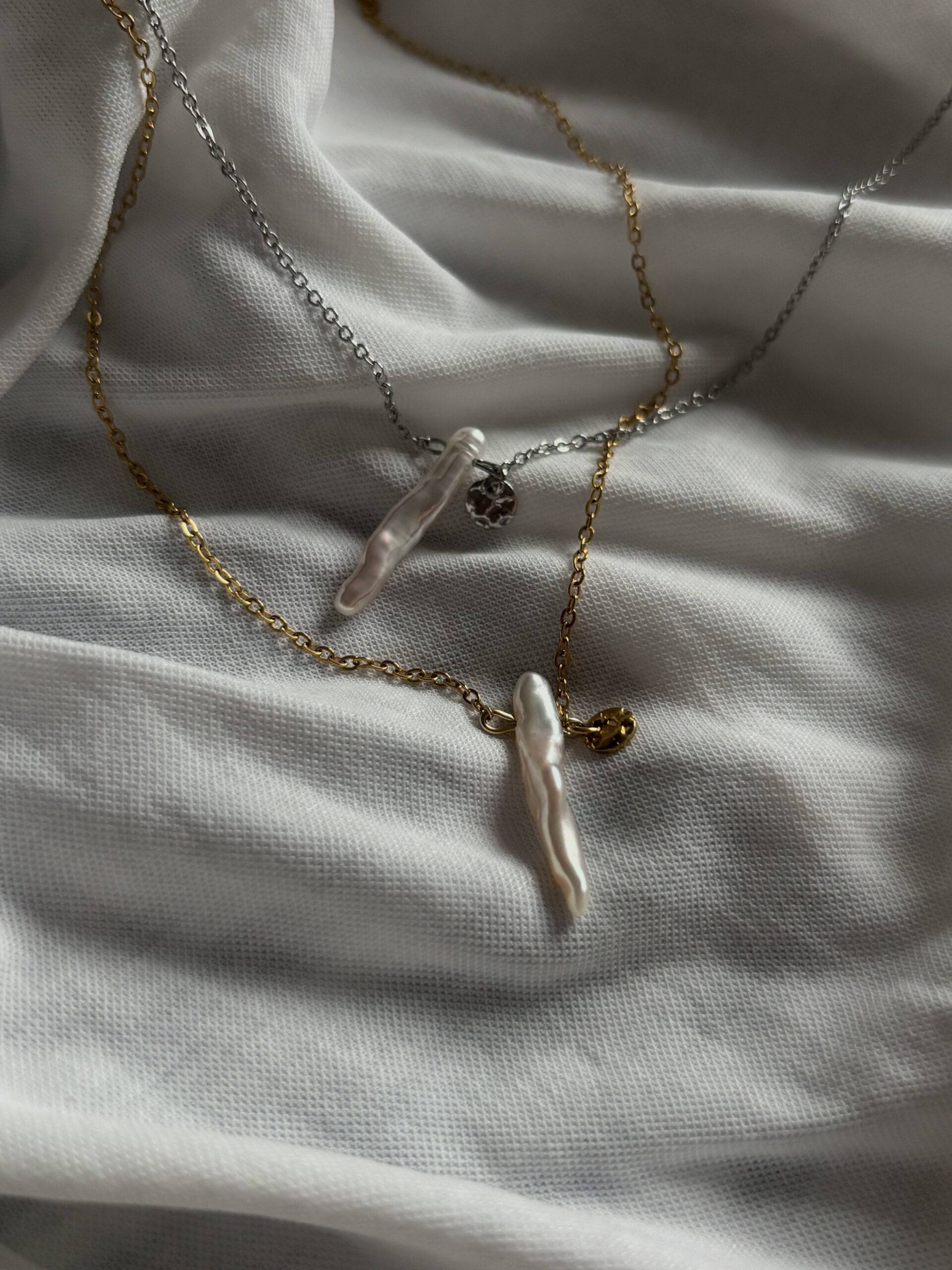 Elegantní náhrdelník z chirurgické oceli zaujme na první pohled svou přirozenou krásou a jedinečným designem. Dominantou je pravá říční perla nepravidelného tvaru, díky které je každý kus naprostý originál. Jemný řetízek je doplněn malým tepaným medailonkem, jenž dodává šperku osobitý a moderní vzhled.