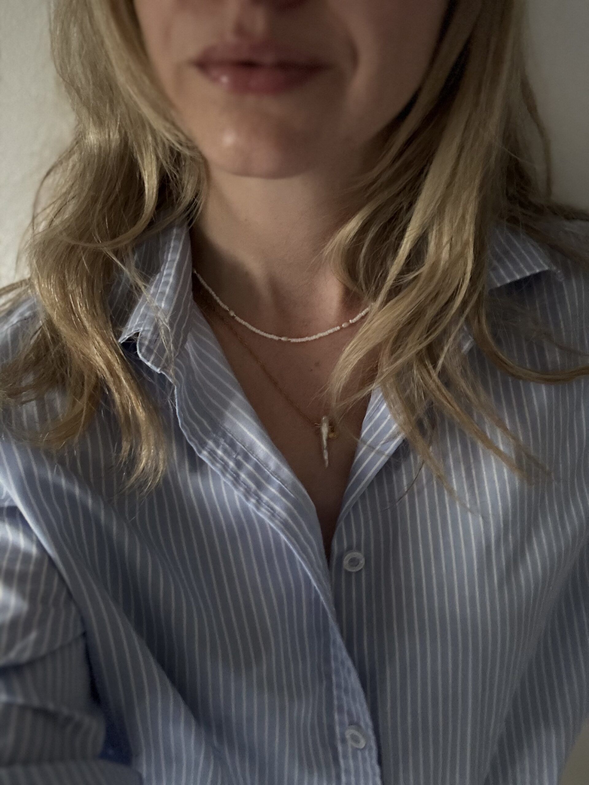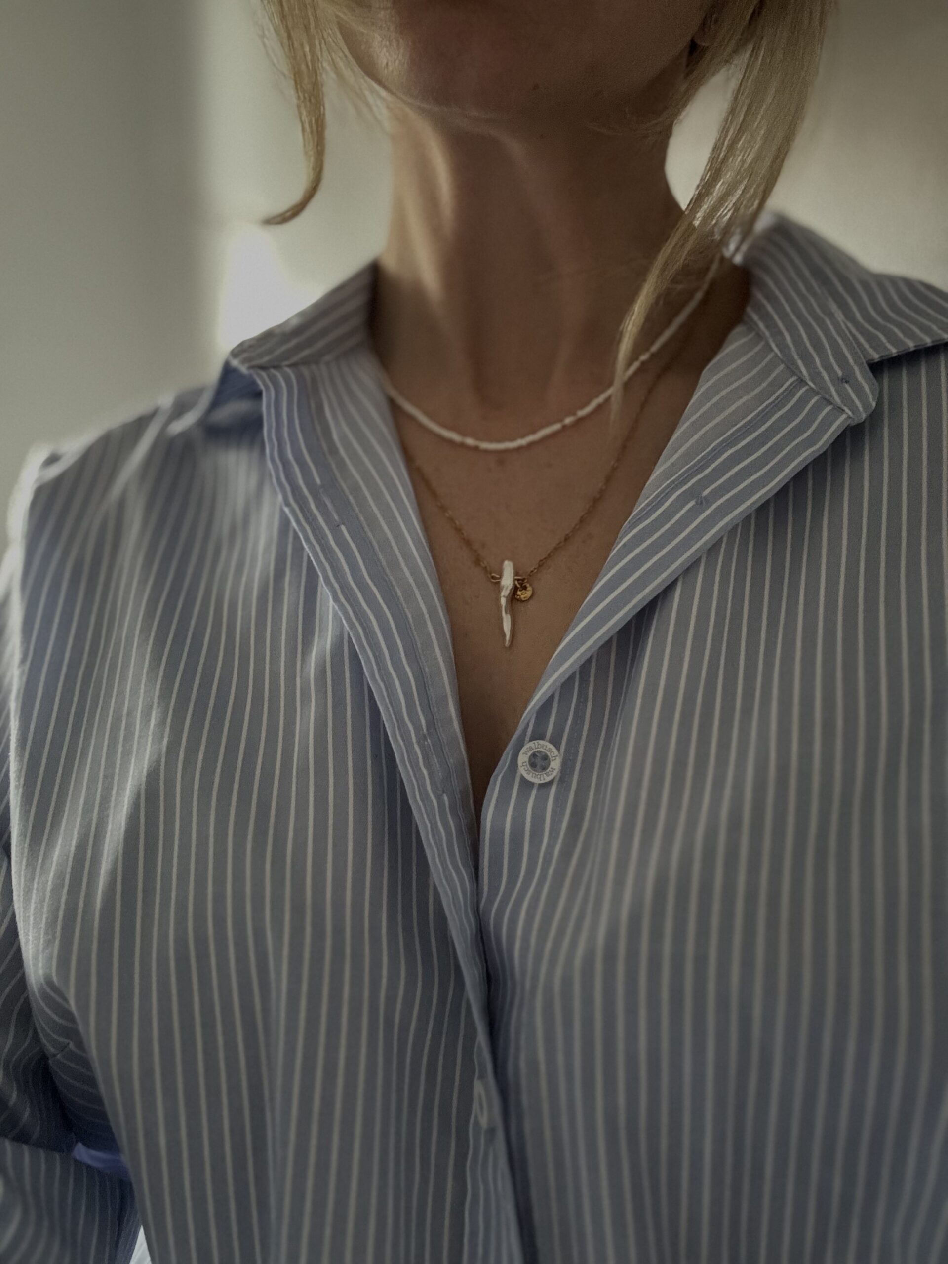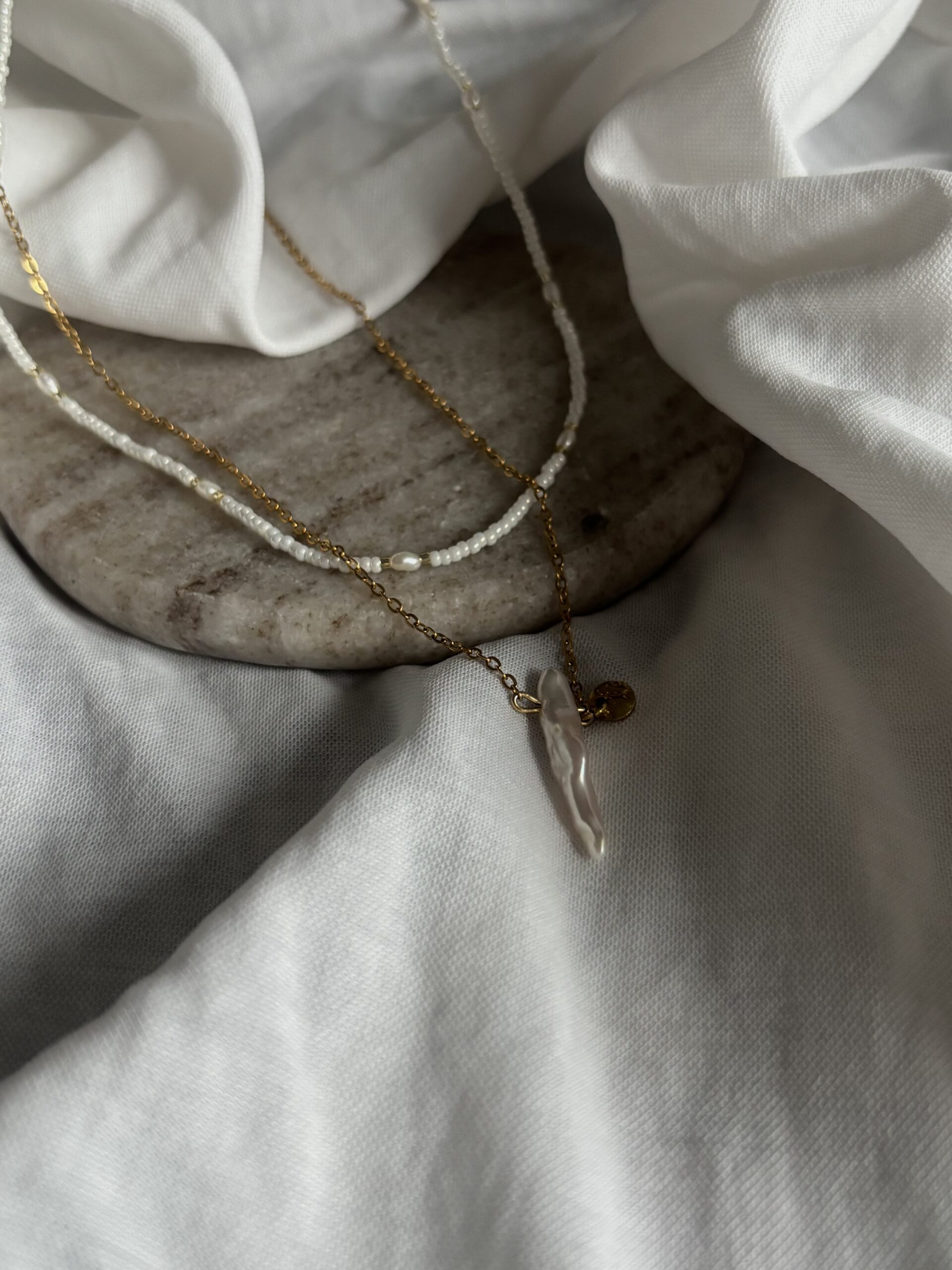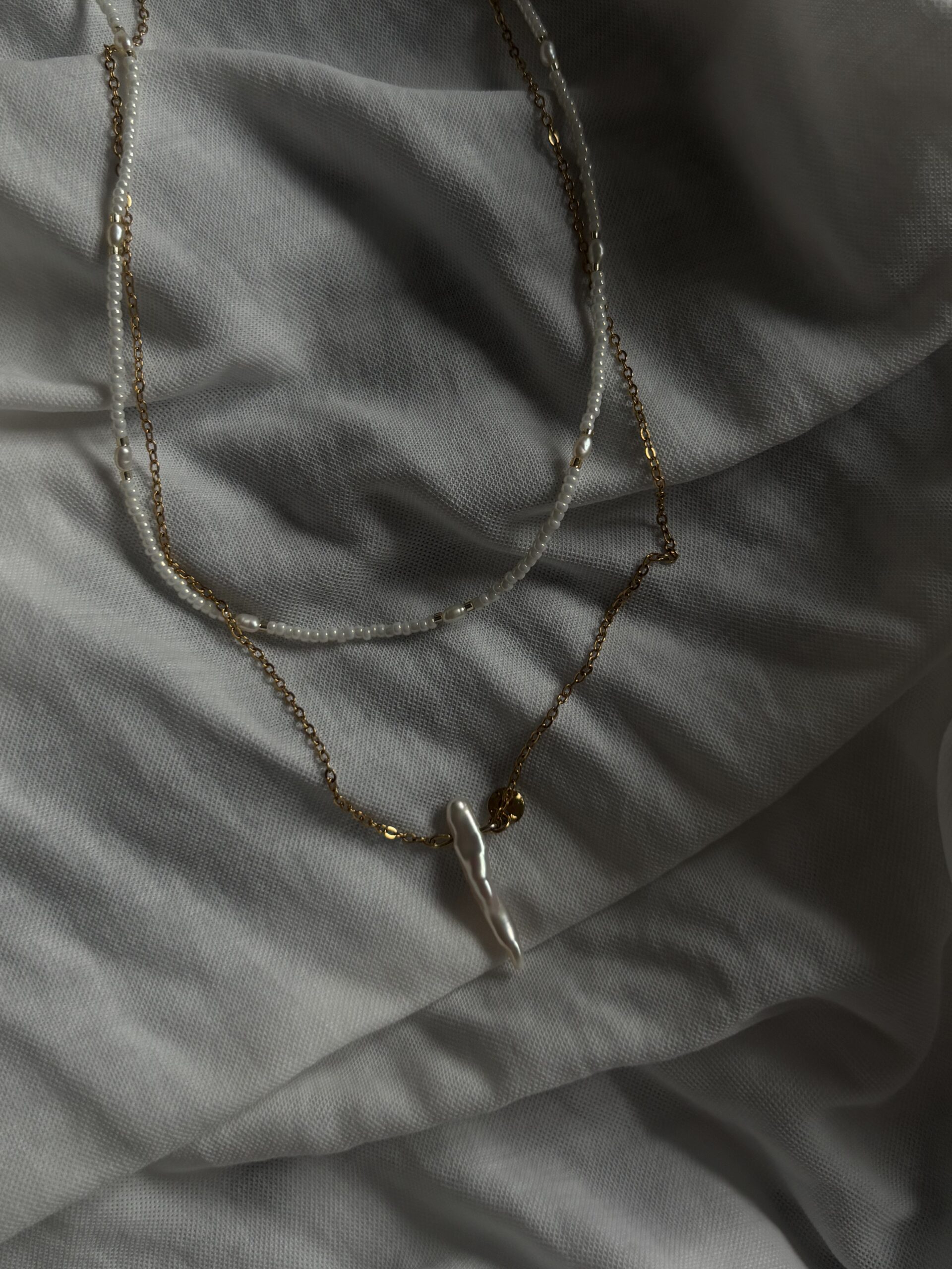 Elegantní náhrdelník z chirurgické oceli zaujme na první pohled svou přirozenou krásou a jedinečným designem. Dominantou je pravá říční perla nepravidelného tvaru, díky které je každý kus naprostý originál. Jemný řetízek je doplněn malým tepaným medailonkem, jenž dodává šperku osobitý a moderní vzhled.